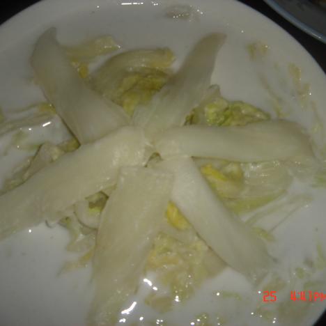 4、将煮熟白菜放锅中,与奶汁拌合略煮,取出白菜,整齐摆放菜碟中,然后将预先盛起之一半奶汁倒至菜面上。