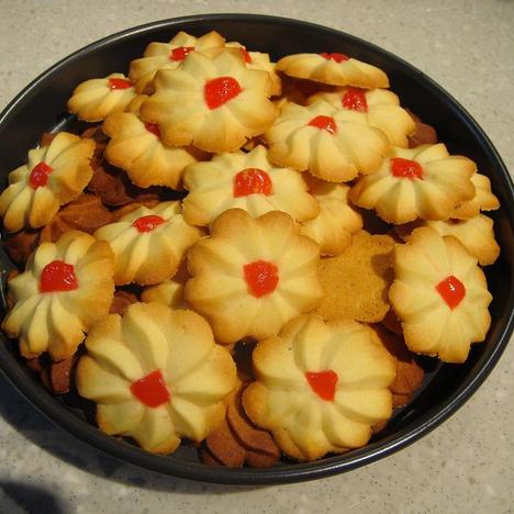 我没低筋粉,用的普通面粉和玉米粉,4比1配的。 注意:‘这是两盘的烤量,入烤箱大约烤了20分钟左右,略略变色后就差不多了,黄油一受热会化开导致曲奇变大不少,所以挤曲奇的时候中间要留一定位置。两盘一起烤的时候中间可以拿出来上下两盘互换位置阿,以免受热不均导致靠近顶层的太热化开,底层的烤糊底呵呵。