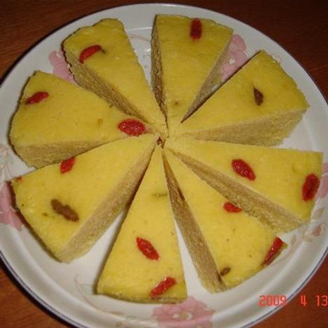 干料:普通白面1杯,黄色玉米面1杯,糖1/2杯(可少放,根据自己口味),泡打粉2小勺,盐1/2小勺,葡萄干,枸杞1杯