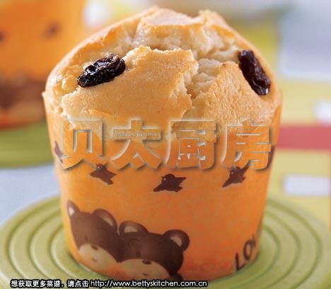 将混合好的面糊倒入纸杯中(约8分满),上面撒入黑葡萄干。