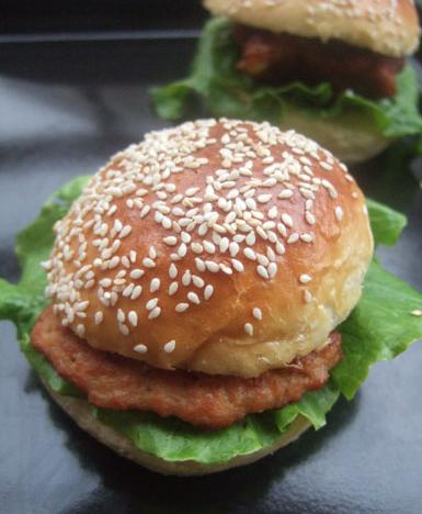 面包烤好冷却对半切开,夹上事先烤好的鸡柳或鸡腿肉块,芝士片、沙拉酱,生菜等,就有了这款大人小孩都爱吃的汉堡包了。