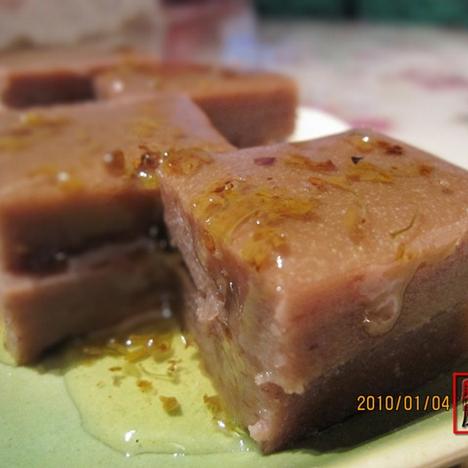 將已成型的紅豆糕切成小塊,淋上桂花糖即可。
