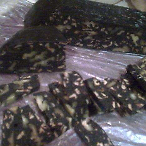6,拉起保鲜膜,将冷却凝固的固元膏先切成大块再切成小片。