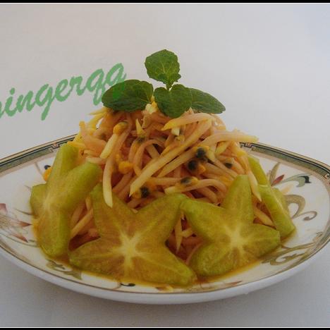 青木瓜半个,百香果3个,杨桃1个,薄荷叶少许,盐适量