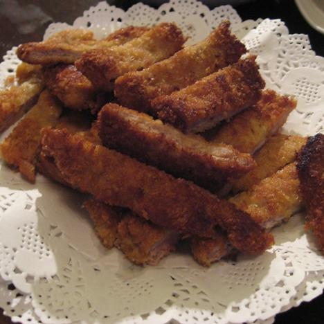 (5)将排骨肉片放入160℃热油中油炸3∼5分钟,至外表呈现金黄色即可捞起。
