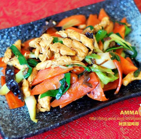 鸡柳,青蒜,胡萝卜,木耳,酱油