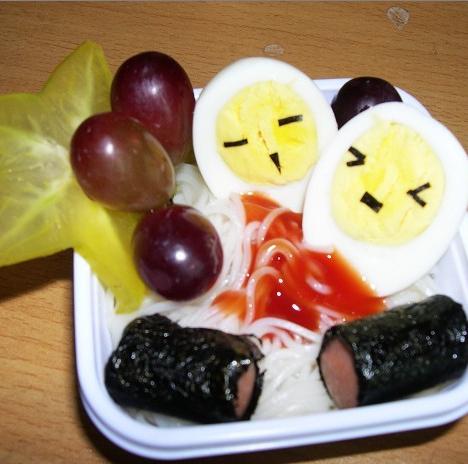 2、鸡蛋煮熟,去壳,切开一半。用紫菜做眼睛,嘴巴。