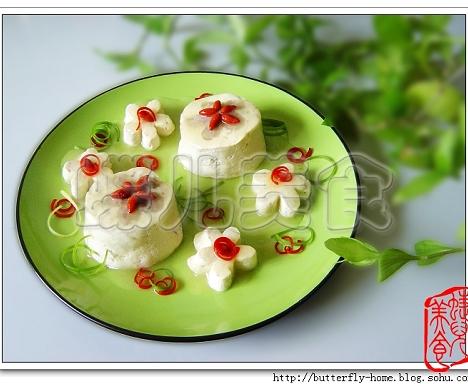 锅内加清水,加高汤精、适量的盐、白糖烧开,以水淀粉勾成玻璃芡,淋在蒸好的梅花豆腐上,撒入葱丝、红椒丝即可。
