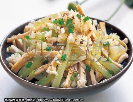 莴笋1根,春笋干100g,蒜茸1茶匙5g,花椒2茶匙10g,香油4茶匙20ml,盐1茶匙5g,香葱1棵