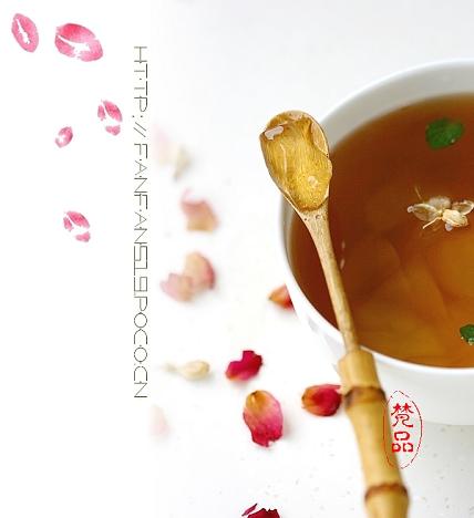 3、吃時只需將涼粉切小塊加蜜蜂放入杯中即可,也可單獨飲花茶,都是清清淡淡好滋味。