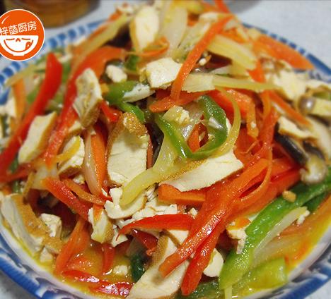 3坐锅热油,爆香大蒜,放入香菇和洋葱炒香,然后加入胡萝卜、红椒和青椒丝,翻炒出香味以后最后加入豆干丝,再烹入一点醋,一点生抽,大火快速的翻炒,等到蔬菜稍微变软以后加入鸡精和盐,最后再撒上一点葱花就可以起锅了。