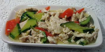 3、热锅温油,下葱姜鲜花菇片,将熟时下黄瓜片煸炒,倒芡汁下鸡片,翻身出锅
