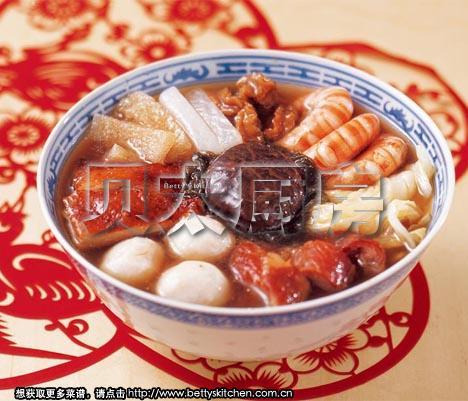 砂锅(或锅仔)内由下至上依次摆入白萝卜、大白菜、浮皮、花菇、鱼丸、蚝豉、烧鹅腿、叉烧肉、基围虾、龙须菜,最后在顶端再摆一枚花菇做装饰,注入适量高汤,加入1茶匙蚝油和盐,用小火煲煮15分钟后即可上桌。