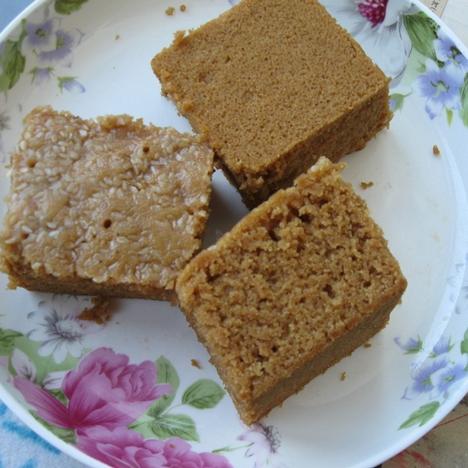 红糖200克,水200克,大米粉125克,低筋面粉125克,玉米粉(淀粉)1小匙,泡打粉2小匙,小苏打粉4分之1小匙,色拉油40克,(玉米油),烤熟的白芝麻5克