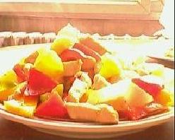 锅内再入油,将切好的菜放入翻炒。注意看洋葱哦,只要它外缘开始变透明了,ok,你就可以将刚才炒好的鸡丁放入一同翻炒了