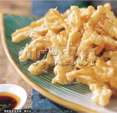3、大火烧热炒锅中的油至7成热,取少许金针菇放入蛋糊中,使金针菇表面均匀地裹上蛋糊,放入油中炸至呈淡金黄色,捞出沥干油分,用同样的方法把所有金针菇都炸好装盘。