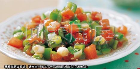 番茄2个约150g,青菜椒1个约80g,青蒜(又叫蒜苗)2根约20g,熟白芝麻2茶匙10g,盐1/2茶匙3g,白砂糖1茶匙5g,油1汤匙15ml