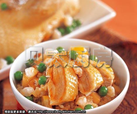 1、鸭肉丁、熟胡萝卜丁、火腿丁、熟香菇丁、熟豌豆丁、熟莲米用鸡汤烩一下;