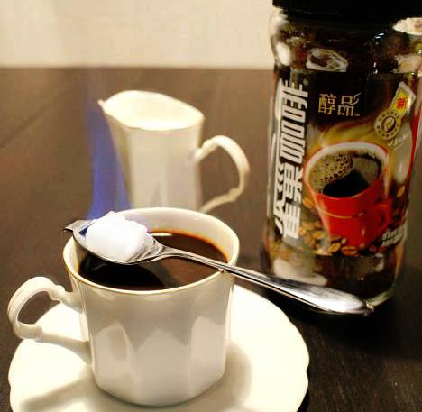 雀巢咖啡醇品100%纯咖啡一杯,放糖一块,白兰地酒适量,皇家倒勾咖啡勺,打火机