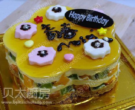 慕斯底:酥性饼干80克,黄油35克,慕斯糊:芒果泥泥150克,淡奶油200克,奶粉一大勺,牛奶150克,郎姆酒10克,砂糖40克,鱼胶粉5克,夹层:芒果丁,猕猴桃丁若干,表面装饰:法国百吉福奶酪(柠檬,草莓各一盒),装饰彩糖,巧克力酱,巧克力生日快乐牌,其他:6寸蛋糕盒