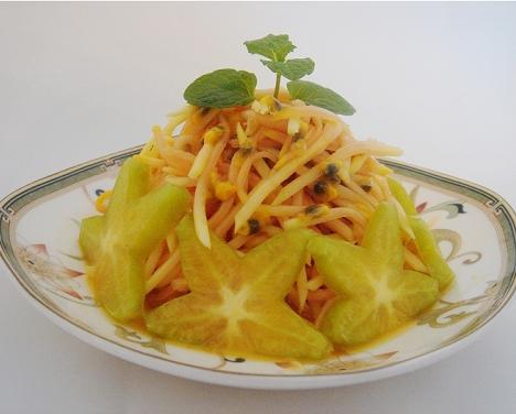 青木瓜半个,百香果3个,杨桃1个,薄荷叶少许,盐适量