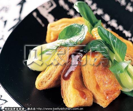 待凉后将炸好的腐皮卷切成3cm宽的段,与焯煮过的油菜心一同码放在盘中,吃时可配蚝油食用。