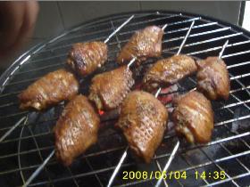 2、把碳烤好,把腌制好的鸡翅串好,开始烤~~用小刀在鸡翅上划几刀~~最后刷蜂蜜~再撒孜然~如果觉得味道不够,再撒点盐~还有辣椒粉~~最后撒白芝麻~~~ok!!