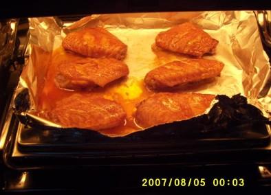 5、10分钟之后,拿出烤翅,再次刷上一层蜂蜜,再烤5分钟就可以啦。因为烤箱是上下一起烤的,所以不用在中途翻面。