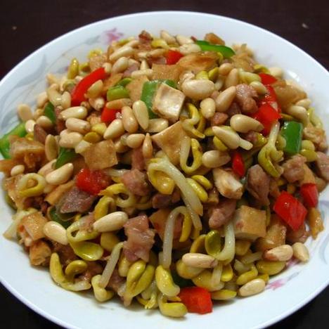 大豆芽500克(要豆芽的豆,芽用来做另一个菜),豆腐干3块,猪肉100克,红椒青椒各1个,油,生抽,盐,糖,姜蓉蒜蓉,松子各适量