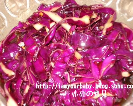 1.紫甘兰洗净,切成细丝,用盐腌2_3个小时,把腌出来的水倒掉.葱姜切丝