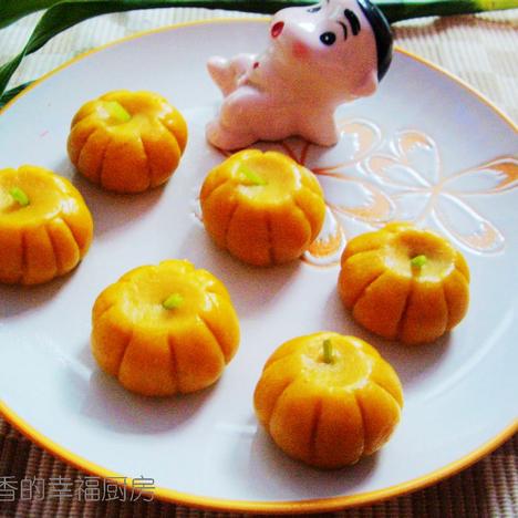 2、和面:将蒸熟的金瓜取出压成泥状,加入糯米粉和成较硬的面团,醒制。