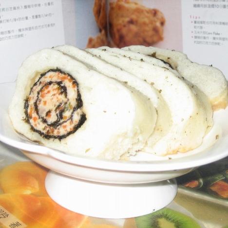 4.发酵面团擀长片,放上紫菜糯米卷,卷起,上笼蒸熟,取出切段即可。