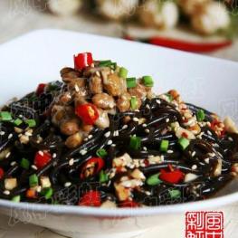 5、纳豆虽对健康极有利,却有着不太宜人的味道和口感,所以把它和味道十足的酸辣蕨根粉搅拌在一起,冲淡了纳豆本身的怪味道,又得到了纳豆与蕨根粉的双重健康保证,堪称绝佳的健康美食。