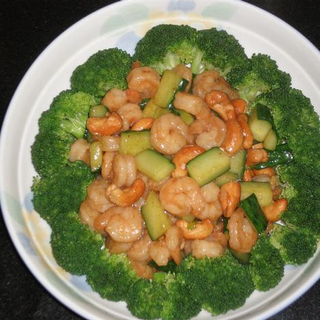 原料:鲜虾仁200g,西兰花150g,黄瓜100g,生腰果12枚,配料:料酒1汤匙,生抽1汤匙,白糖2/3汤匙,食盐,葱,姜,淀粉适量