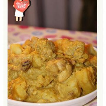 3、起油锅,放葱姜,炒出香味后倒入鸡块和土豆,喷料酒,翻炒,可以加少量的盐,一勺味好美油咖喱,倒入牛奶,中小火慢炖。汁水差不多收干就可以出锅了。