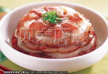 4. 蒸时加入点高汤, 用个盘将菜盖住, 高压锅蒸上25分钟, 其它的锅要蒸上40--50分钟;出锅后立即倒扣,在表面撒些小葱末即可。