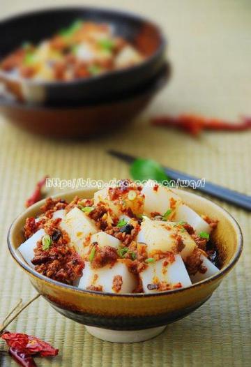 3.调一中碗的味:1/2茶匙蒜泥,1/3茶匙姜汁,复合酱油大半汤匙,醋1/2汤匙,红油辣子1汤匙,花椒粉和味精各少许,加入葱花一起调匀浇在凉粉上。吃时拌匀即可。