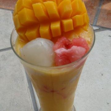 椰奶(1听),芒果(2个),西瓜(少许),荔枝(2~3个),柠檬(1个),冰块(少许)
