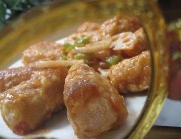 4、中火煮沸3tbs水,调入糖、盐、白醋和番茄酱,放入藕片和青椒片后淋入水淀粉勾芡,倒入炸好的素排炒匀,出锅前点些香油即可。
