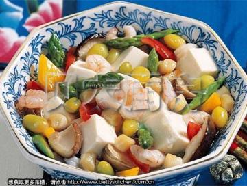 嫩豆腐切成2cm见方的小块。芦笋削去根部老皮,洗净后斜刀切成5cm长的小段。红菜椒和黄菜椒洗净去籽,再切成菱形小片。香菇洗净去蒂,切成4瓣。草菇去根部对半切开。