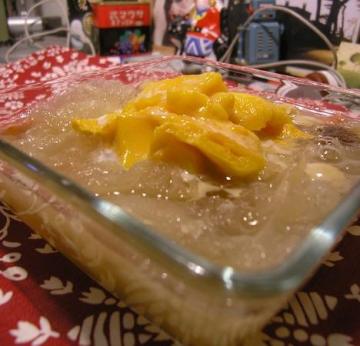 5、吃时取出,芒果剥皮,用小勺刮成条状放进银耳羹中即可。