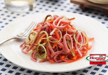 荷美尔牛肉火腿片100g,芹菜100g,胡萝卜100g,香菇4朵,红椒1根,盐1/2茶匙3g,鸡精2g,白胡椒粉2g