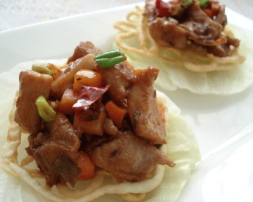 西生菜中摆上炸好的面条,倒入适量兔丁即可。