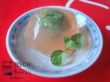 琼脂或明胶粉适量,水1杯,糖35g,梅酒1杯,青梅(浸过梅酒)4个