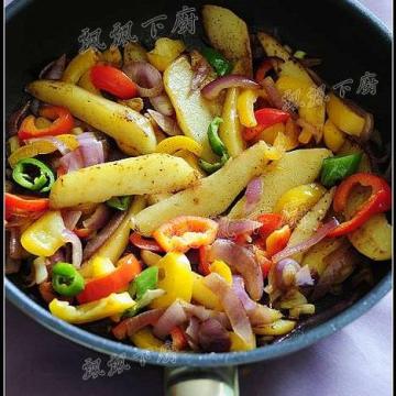 3:土豆基本成熟时加入洋葱及彩椒略略颠炒至土豆全熟