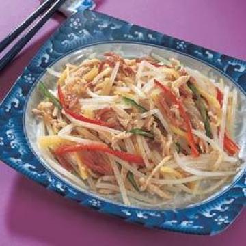3.将豆芽、鸡丝和辣椒丝一起放入碗内,加精盐、味精、白糖拌匀,淋上香油即可。