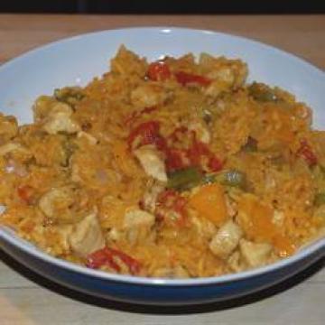 3.往锅内加绿椒、洋葱和大蒜炒5分钟。加米饭翻炒1-2分钟至米饭不再透明。下鸡汤、白葡萄酒、藏红花和西红柿翻炒。撒辣椒粉、盐和胡椒调味,再放一点油;盖上盖煮大概20分钟。
