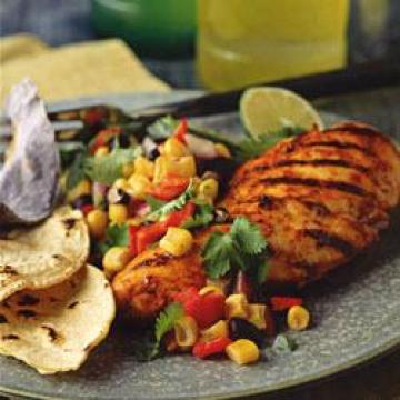 大蒜2瓣,切末,辣椒粉2茶匙,盐1/2茶匙,现榨的莱姆(青柠)汁3汤匙,蔬菜油2汤匙,无骨去皮鸡脯肉680克,用肉槌拍打成1厘米厚,低钠零脂肪鸡汤180毫升,新鲜玉米(粟米)3棵,弄成粒(也可用罐装或冷冻玉米粒),去籽切丁的烤红甜椒1个,罐装黑豆300克,沥干后用水冲洗,切碎的红洋葱2汤匙,墨西哥辣椒(jalapepepper)1个,去籽后切碎,切碎的香菜(芫荽)3汤匙