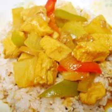 去皮去骨鸡胸肉910克,切成1.5厘米方块,盐和胡椒粉6克,或适量,植物油20毫升,咖喱粉15克,洋葱半个,切薄片,大蒜2瓣,压碎,椰奶1罐(420毫升),罐装碎的熟番茄1罐(410克),罐装番茄酱1罐(225克),糖40克