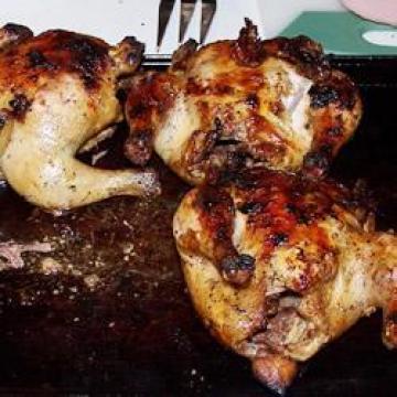 3.在预热好的烤炉上烤1小时左右,不时刷上余下的腌泡汁,直到鸡不再是粉红色,酱汁收干就烤好了。
